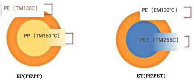 第一種由PE/PP復(fù)合,皮層為PE(聚乙烯,熔點(diǎn)130℃),芯層為PP (聚丙烯,熔點(diǎn)165℃)。