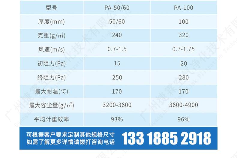 玻璃纖維過濾棉型號 | PA-50/60 | PA-100 |